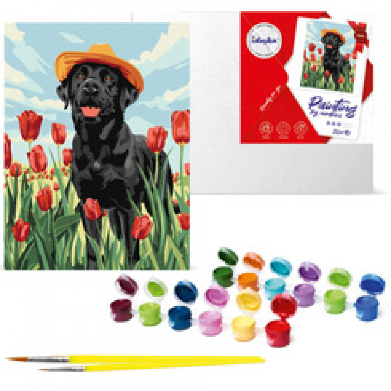 - Gotowe do malowania płótno z eleganckim motywem „Uroczy labrador”, podzielone na pola oznaczone numerami