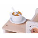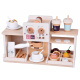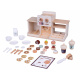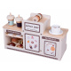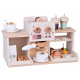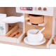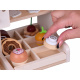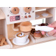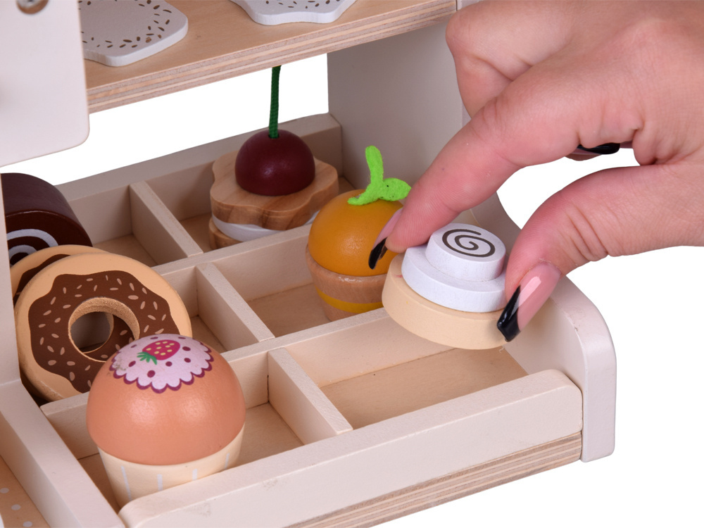 Zabawka została wykonana z trwałego drewna i pomalowana bezpiecznymi, nietoksycznymi farbami. Delikatna kolorystyka i dbałość o detale sprawiają, że kawiarnia pięknie prezentuje się w każdym dziecięcym pokoju.
