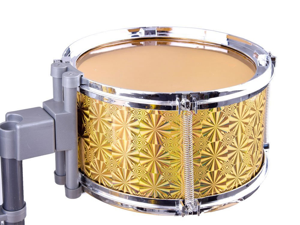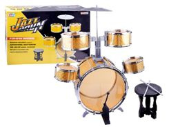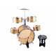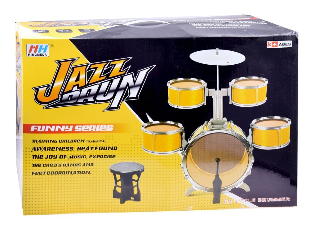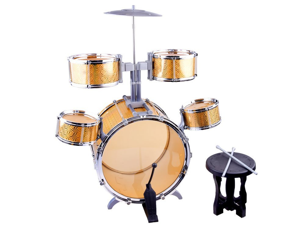 Kompletny zestaw dla małego perkusisty to 5 bębnowa perkusja z krzesełkiem. Zestaw w efektownym złotym kolorze zapewni i pozwoli na wydobycie pasji z małego perkusisty. Zabawka częściowo wykonana jest z plastiku, a złote boki perkusji z grubego kartonu.