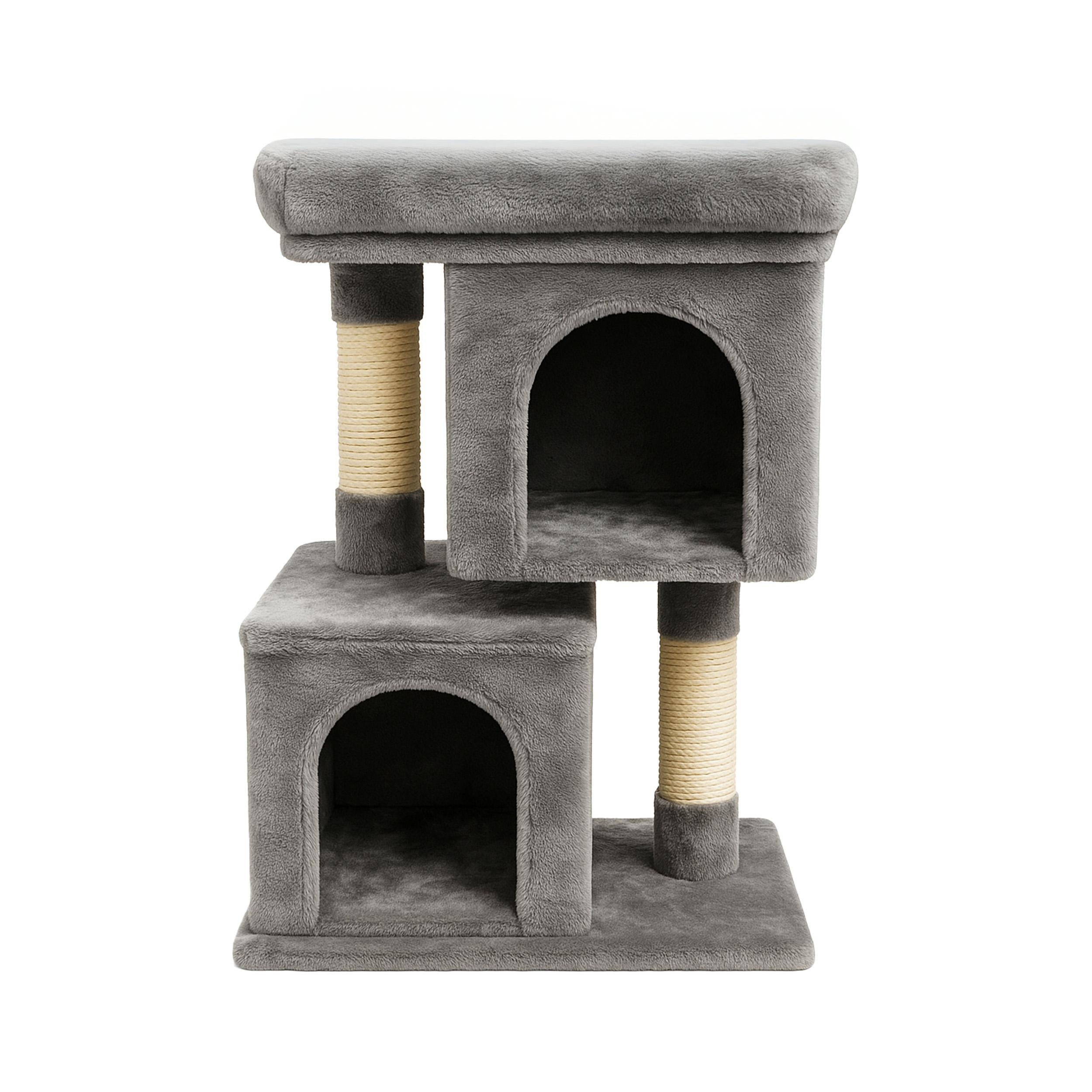 Dwupoziomowy drapak dla kota z dwoma przytulnymi budkami to idealne miejsce do odpoczynku, zabawy i ostrzenia pazurków. Obity miękkim pluszem i wyposażony w słupki, zapewnia komfort oraz dba o kocie potrzeby. Kompaktowy i stabilny, świetnie sprawdzi się w każdym wnętrzu. Specyfikacja: wymiary podstawy: 30x40cm wysokość:67cm materiał wykonania: MDF, obicie mięki plusz 2 poziomy budka dla kota leżanka Ilość sztuk na palecie: 60