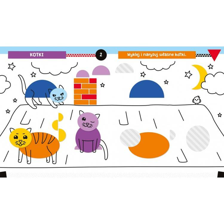 Wyklejanka, rysowanka z figurami to książeczka dla kreatywnego przedszkolaka. Dziecko przykleja naklejki i dorysowuje elementy, tworząc w ten sposób obrazek z figur geometrycznych.